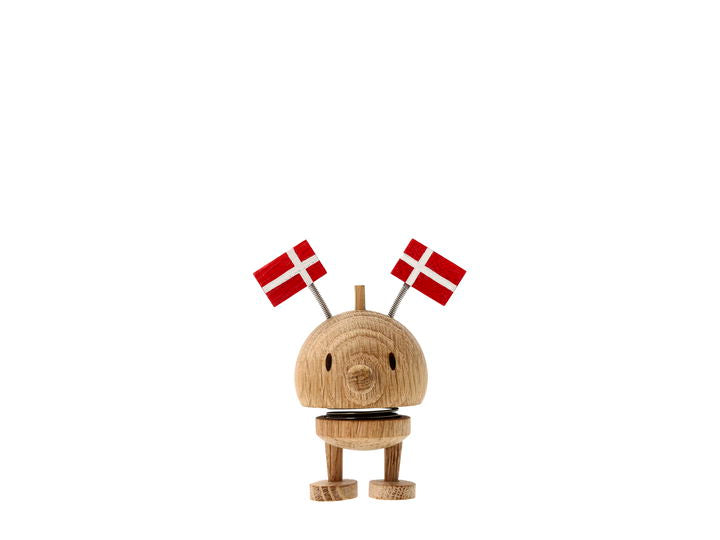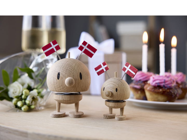 No celebration is too small – or too big. Celebration Bumble is a cheerful addition that makes it easy to set the table with a smile.Give it a little nudge, and the party spirit instantly comes alive. It bounces with joy and spreads good vibes to everyone around. Made from beautiful oak and decorated with flags, Celebration Bumble is charming, ready to celebrate, and always up for a little hop.Celebration Bumble spreads happiness on the gift table, in the windowsill, or at the centre of the birthday table – making the day just a little more festive.The product is made from FSC™-certified oak (FSC-C166612).H 9.9 cm, D 8 cmWith a strong belief in the power of smiles, Gustav Ehrenreich founded his happy Hoptimist movement in the late 1960s. The aim was to create a figurine that would serve as a constant reminder to stay positive and optimistic. For although the 1960s are often referred to as the “Swinging Sixties”, the decade was marked by unrest. This made Ehrenreich’s design a welcome spreader of joy in an otherwise turbulent time.Bimble and Bumble represent the very first Hoptimists designed by Ehrenreich: A girl with smiling eyes wearing a dress and an alert, inquisitive boy with a tuft on his head. Today, the happy Hoptimists are part of Danish design history and they spark joy all over the world. The figurines are available in four different sizes and in a wide range of colours that spread plenty of playfulness, cheer and happiness.There is a Hoptimist for every occasion and every person.