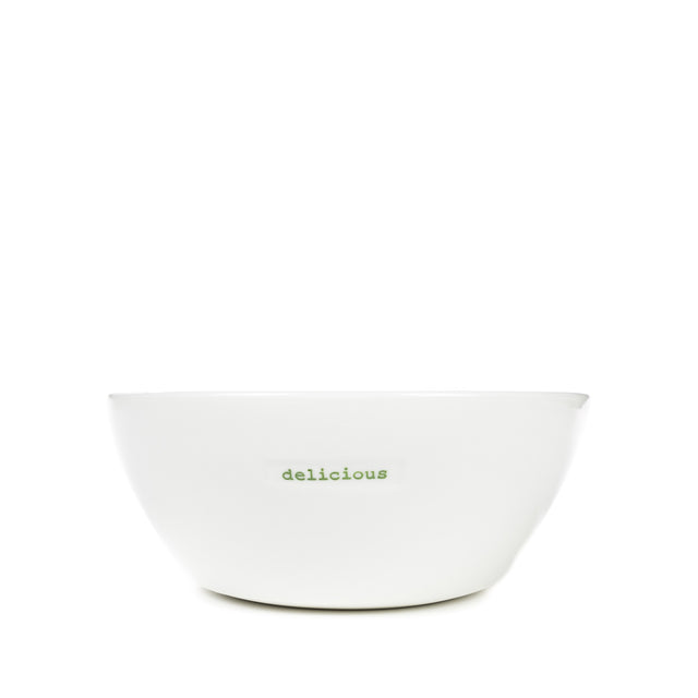 Serve meals with style using this Large Green Delicious Bowl from Keith Brymer Jones' celebrated Word Range. The appetizing word "delicious" is hand-stamped in fresh green typewriter font onto high-quality white ceramic, adding contemporary flair to your dining table. Perfect for pasta, salads or soups, its generous capacity makes it ideal for family meals. The durable glaze ensures easy cleaning (dishwasher safe) while maintaining its vibrant finish. A wonderful gift for food lovers or a stylish upgrade to your own kitchenware collection. Keith's signature craftsmanship guarantees each piece has unique character, just like your culinary creations.
