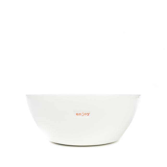 Brighten mealtimes with this Large Orange Enjoy Bowl from ceramic artist Keith Brymer Jones' iconic Word Range. The cheerful word "enjoy" is hand-debossed in warm orange typewriter font into smooth white ceramic, creating a tactile dining experience. With ample space for generous portions, it's perfect for everyday use while adding a pop of color to your table setting. Microwave and dishwasher safe for convenience, this bowl makes an excellent gift for hosts or a treat for your own kitchen. Keith's philosophy of creating happiness through design shines in this functional yet emotionally resonant piece.