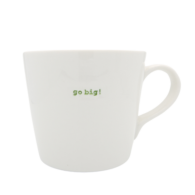 Embrace life's grand moments with this Large Green Go Big! Bucket Mug from Keith Brymer Jones' motivational Word Range. The inspiring phrase is hand-stamped in vibrant green onto premium white porcelain - a daily nudge to dream large. The 500ml capacity matches its ambitious spirit, perfect for goal-setters who need fuel for their dreams. Comfortable bucket handle and durable ceramic ensure pleasant daily use (dishwasher/microwave safe). An excellent gift for graduates, entrepreneurs, or anyone embarking on new adventures. Keith's signature craftsmanship means each mug has unique character - just like the person using it.