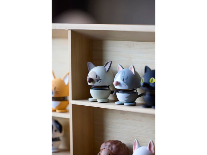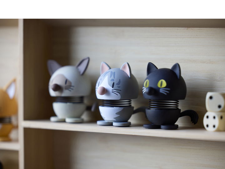 Confident and calm. This Hoptimist cat is inspired by the majestic Maine Coon. It simply stands there looking friendly. And it rewards you with a little bounce when you give it a bit of attention.A delightful gift idea for anyone who loves cats. Even the real cat in the house will probably be unable to resist giving the new playmate a gentle nudge.H 5.3 cm, D 4.1 cmWith a strong belief in the power of smiles, Gustav Ehrenreich founded his happy Hoptimist movement in the late 1960s. The aim was to create a figurine that would serve as a constant reminder to stay positive and optimistic. For although the 1960s are often referred to as the “Swinging Sixties”, the decade was marked by unrest. This made Ehrenreich’s design a welcome spreader of joy in an otherwise turbulent time.Bimble and Bumble represent the very first Hoptimists designed by Ehrenreich: A girl with smiling eyes wearing a dress and an alert, inquisitive boy with a tuft on his head. Today, the happy Hoptimists are part of Danish design history and they spark joy all over the world. The figurines are available in four different sizes and in a wide range of colours that spread plenty of playfulness, cheer and happiness.There is a Hoptimist for every occasion and every person.
