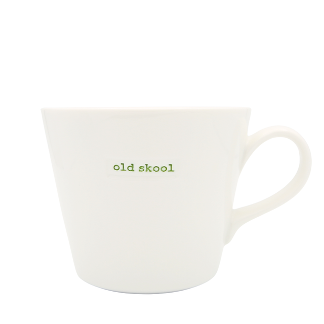 Keep it old skool with this fun and stylish Keith Brymer Jones medium mug hand stamped with ‘old skool’ in green.Each item features hand stamped phrase or word(s) in colourful retro typewriter font. Contemporary, touch of vintage and a large portion of humour, the Word Range will bring families and friends together.