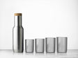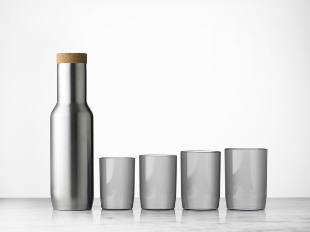 Stainless steel carafe with cork lid comes with 4 glasses that stack into each other. Distinctive Danish design that guarantees to make an impact on your tabletop